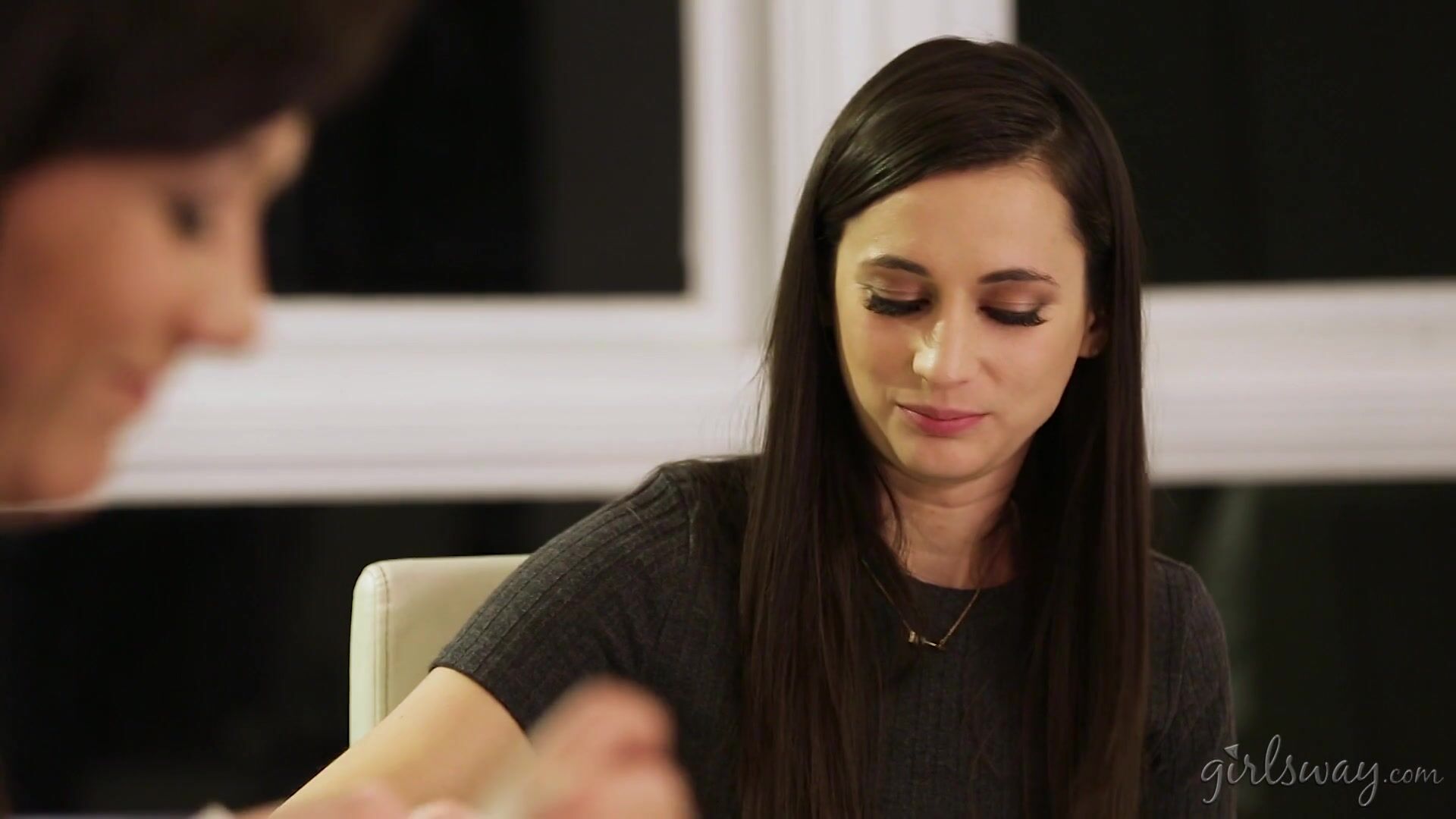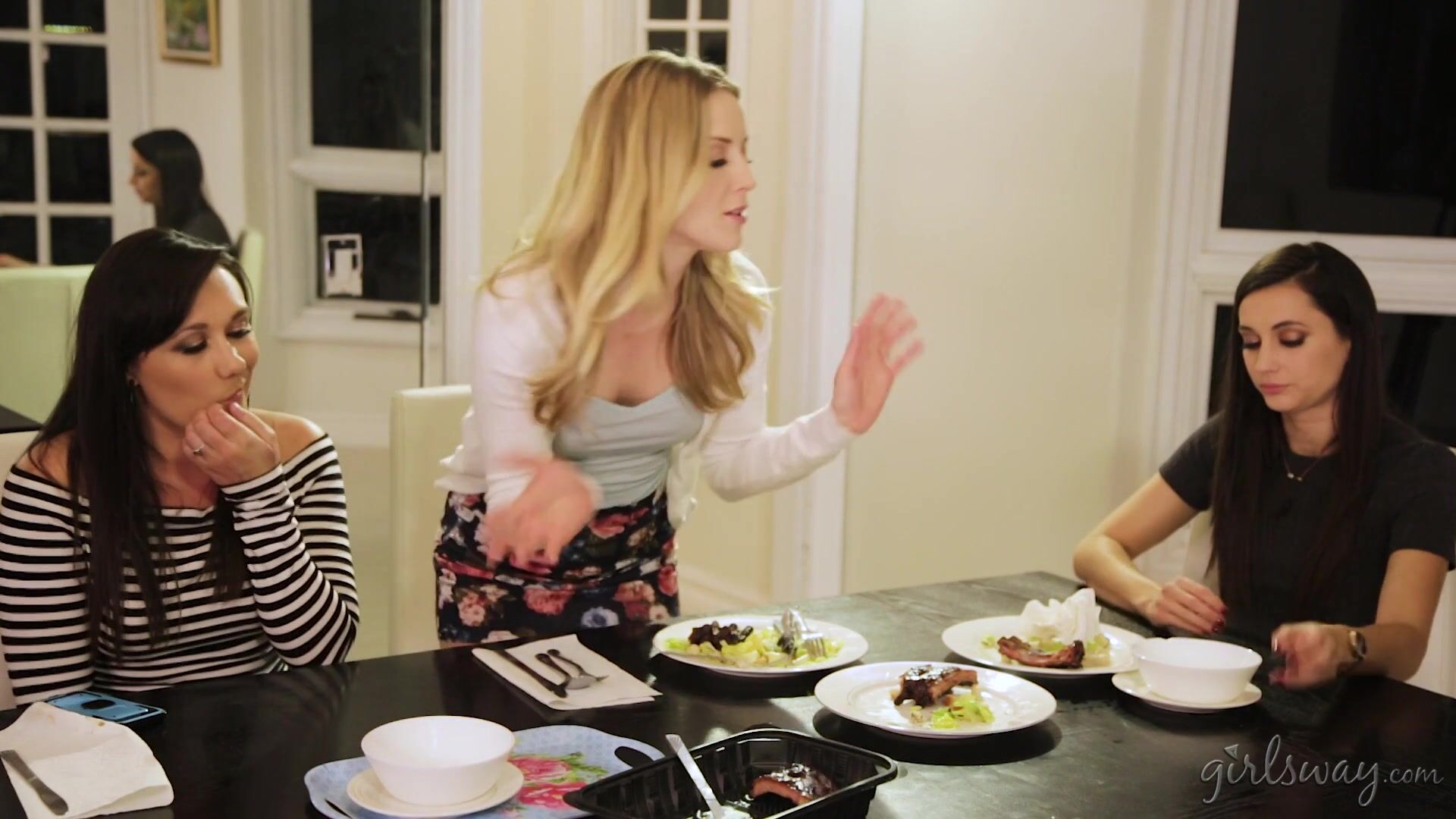 Karla Kush and her wife Sinn Sage are hosting a dinner for Karla's business partner Georgia Jones. It's been two years since Georgia divorced her husband and joined forces with Sinn to start a successful business. When Sinn leaves the table to fix a snafu upstairs in the office, Georgia joins Karla in the kitchen. She pulls the housewife away from the dishes and grabs her crotch. Karla tries to pry off Georgia but she's too hungry for pussy. Georgia hikes up Karla's skirt and hoists her leg onto the counter. She fingers Karla's pussy until it squirts for the first time! Karla doesn't understand how Georgia made her pussy juice like that, but she's suddenly thrust into a state of confusion and ecstasy, and keeps cumming all over Georgia's fingers. She begs Georgia to stop making her cheat. Georgia eases up when Sinn comes downstairs, and Karla regains her composure. But Sinn gets called away on business again. Karla darts under the table to escape Georgia's clutches, but Georgia follows her and pulls aside the crotch of her panties. Karla is paralyzed with pleasure as Georgia teases her clit and juices the squirt from her pussy. Georgia knows that cheaters always squirt. The next time Sinn comes downstairs, Georgia silences Karla's moans with a hand over her mouth. Sinn doesn't see her cheating wife under the table getting fingered by her business partner, but she finds the puddle of squirt by the sink. When she leaves to find a mop, Georgia decides it's her turn to orgasm. She plants Karla's mouth on her pussy and won't get up till she cums hard in her mouth. Even then, Georgia refuses to leave Karla alone until all the liquid is juiced from her body. Will she drain her pussy before Sinn catches them?! Click to find out!